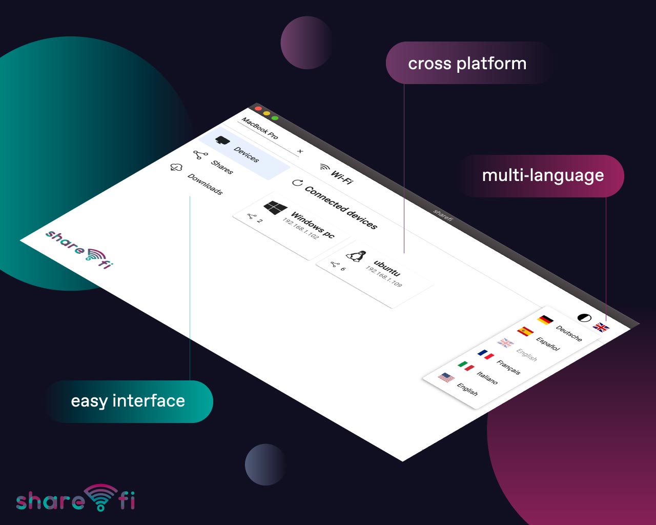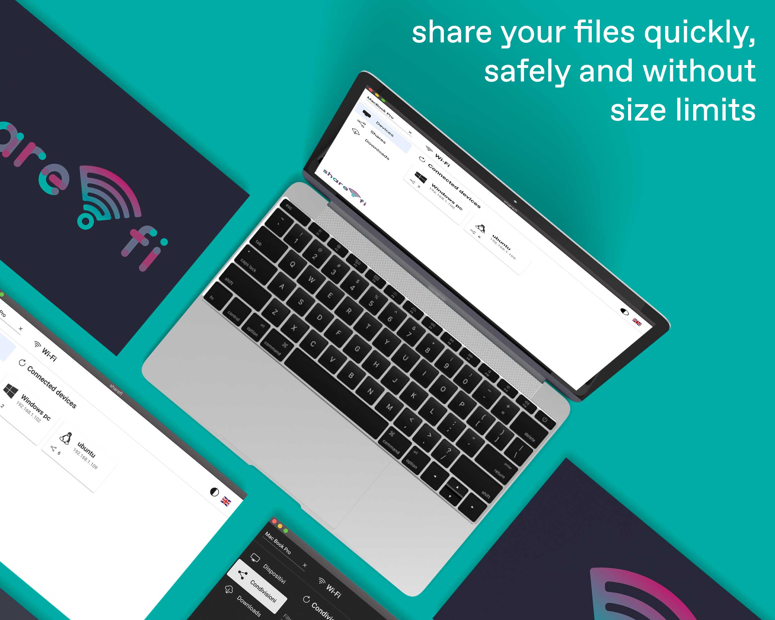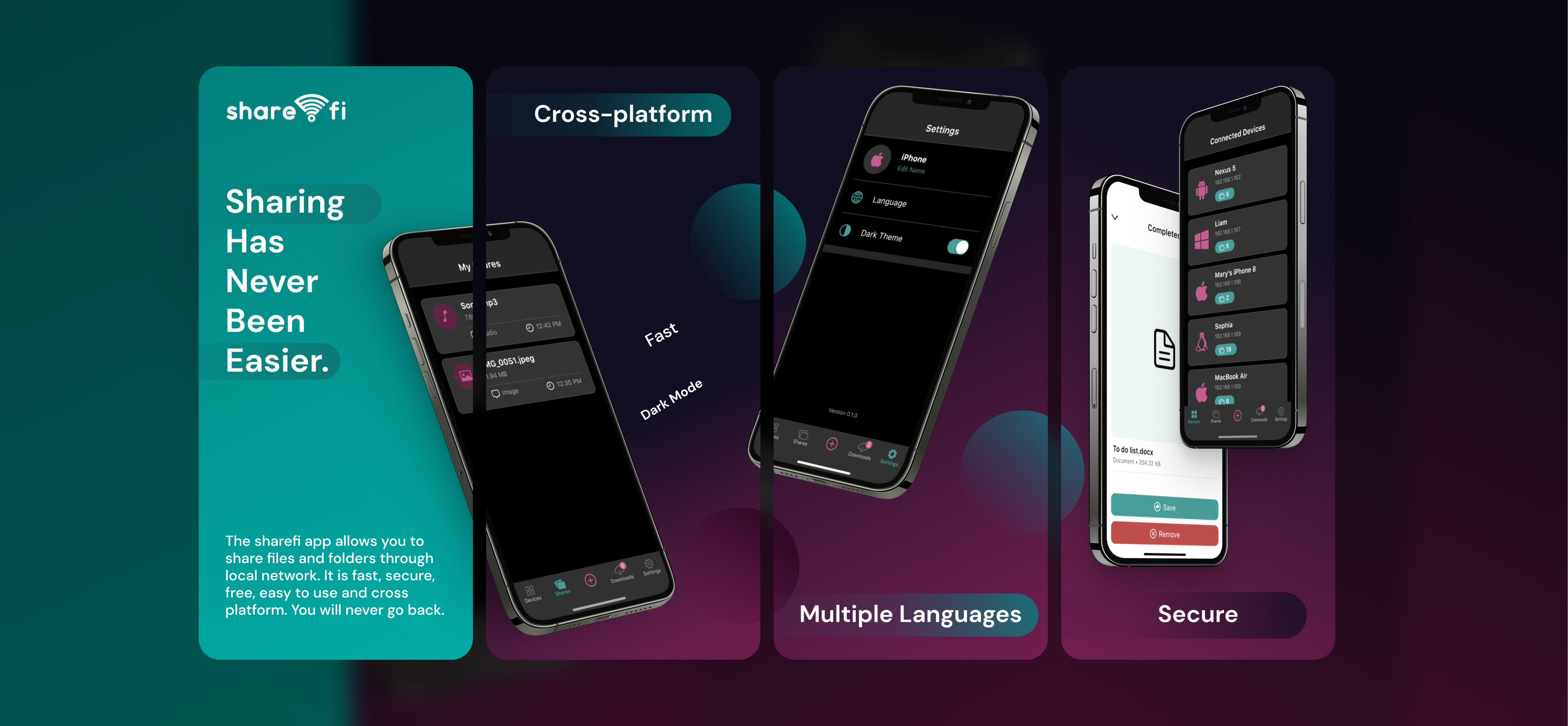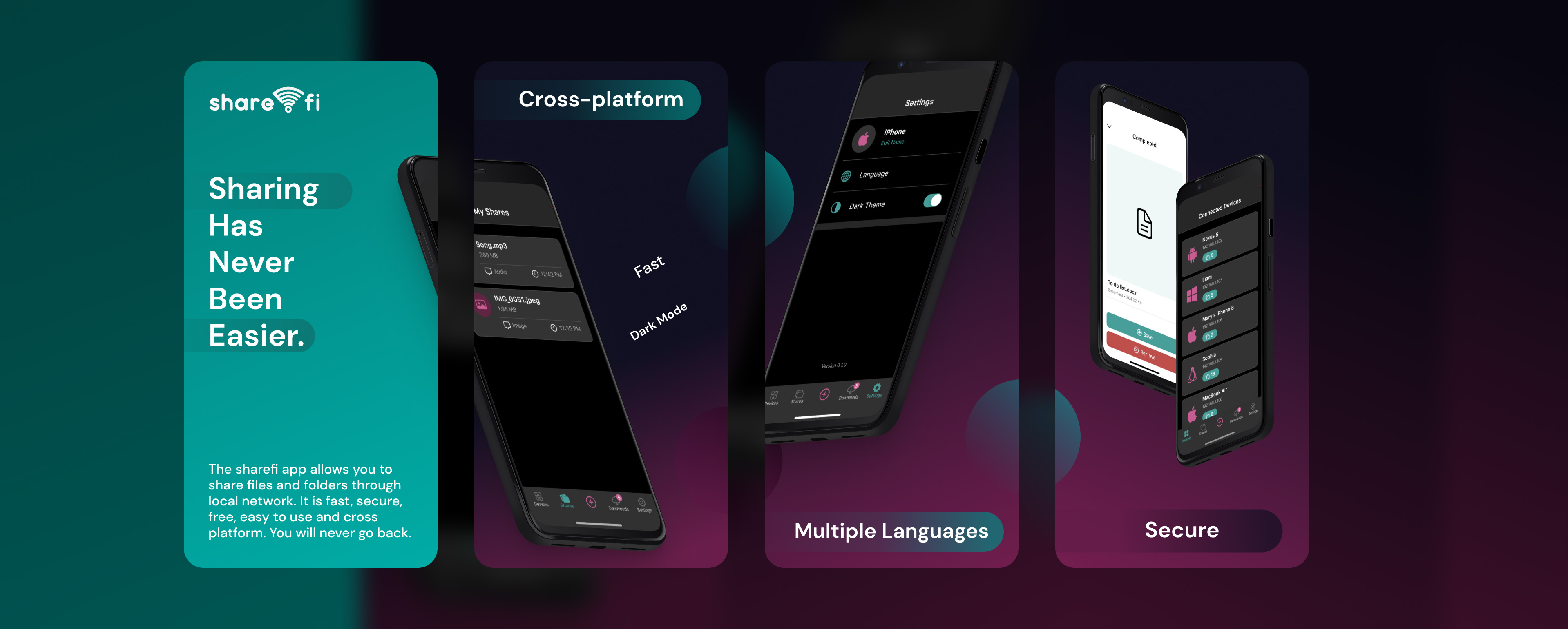 The sharefi app allows you to share files and folders through local network. It is fast, secure, free, easy to use and cross platform. You will never go back.